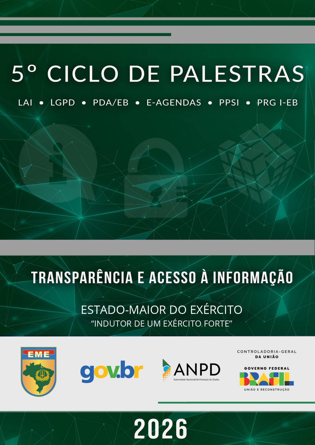 QGEx Brasília/DF – No período de 27 a 29 de abril de 2026, o Estado-Maior do Exército promoverá o 5º Ciclo de Palestras sobre Lei de Acesso à Informação, Lei Geral de Proteção de Dados, Plano de Dados Abertos, Sistema Informatizado de Agendas do Governo Federal, Programa de Privacidade de Segurança da Informação e Programa de Integridade do Exército Brasileiro.
