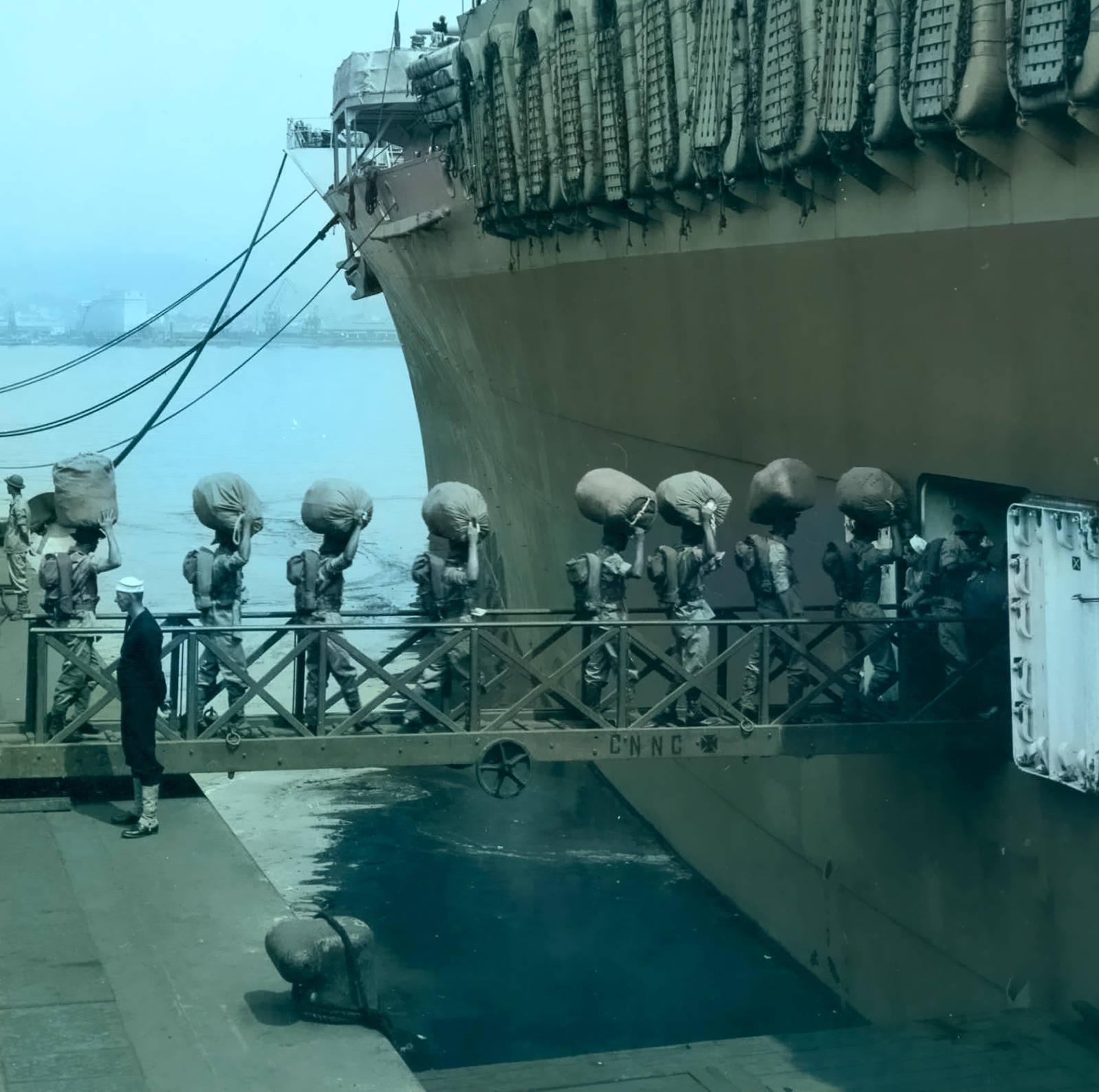 Uma guarda de honra formada ao longo do cais prestou continência ao General Mascarenhas de Moraes.