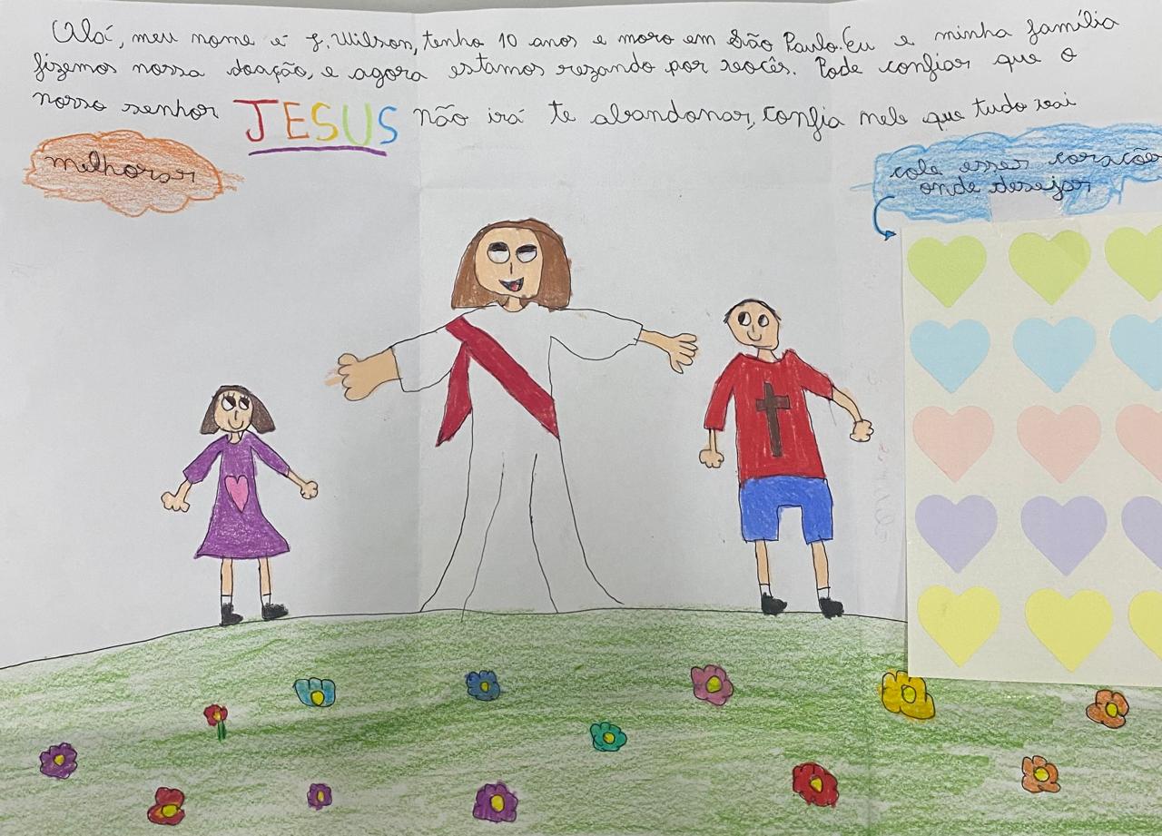 “Sei que é um momento delicado, mas vai dar tudo certo, vocês vão abrir novamente seus comércios, suas casas vão estar limpas e cheirosas novamente, e vão voltar a ter um lar aconchegante”, diz trecho de uma das cartas que, além das palavras, foram acompanhadas de desenhos pintados à mão.