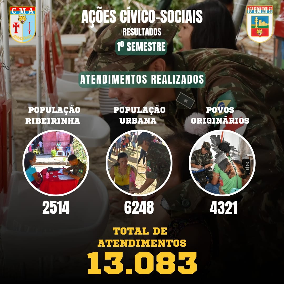 Já na área de apoio à sociedade civil, a mão amiga da 16ª Brigada de Infantaria de Selva levou 13,1 mil atendimentos nas áreas médica, educacional e legal às populações urbana, ribeirinha e indígena da região.