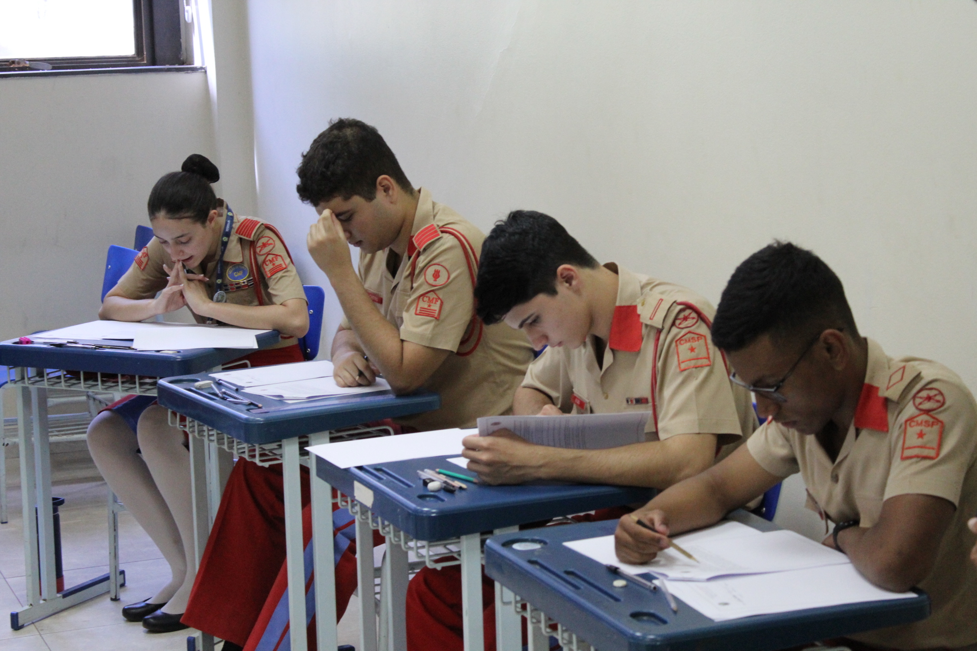 Nas provas da Olimpíada de Matemática e Física, dois estudantes de cada colégio tiveram que resolver questões elaboradas por alunos do Instituto Militar de Engenharia (IME), com vasta experiência em olimpíadas nacionais e internacionais. As questões, de alta complexidade, incluíram temas como análise combinatória e conteúdos do 1º ano do Ensino Médio.