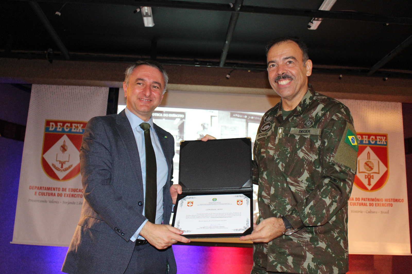 Em seguida, o Diretor do Patrimônio Histórico e Cultural do Exército, General Luciano Antonio Sibinel, apresentou os projetos para o ano de 2024 e destacou a importância do evento. “Essa cerimônia marca a abertura dos trabalhos culturais para o ano de 2024, que tem como tema central os 80 anos da Força Expedicionária”, pontuou. O evento contou ainda com uma palestra sobre “A arte produzida pelos pracinhas”, proferida pelo professor do King's College London, Dr Vinicius Mariano de Carvalho.