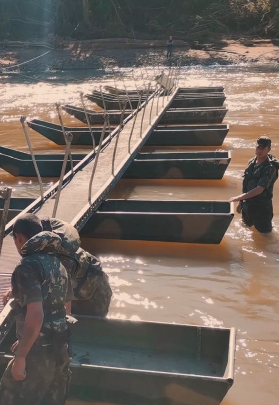 Para a circulação de veículos e de cargas pesadas, um comboio transportando 60 metros de ponte desmontável também chegou do Mato Grosso do Sul em 17 viaturas. A estrutura suporta até 80 toneladas e será decisiva no reestabelecimento de vias de acesso nas regiões alagadas e destruídas.