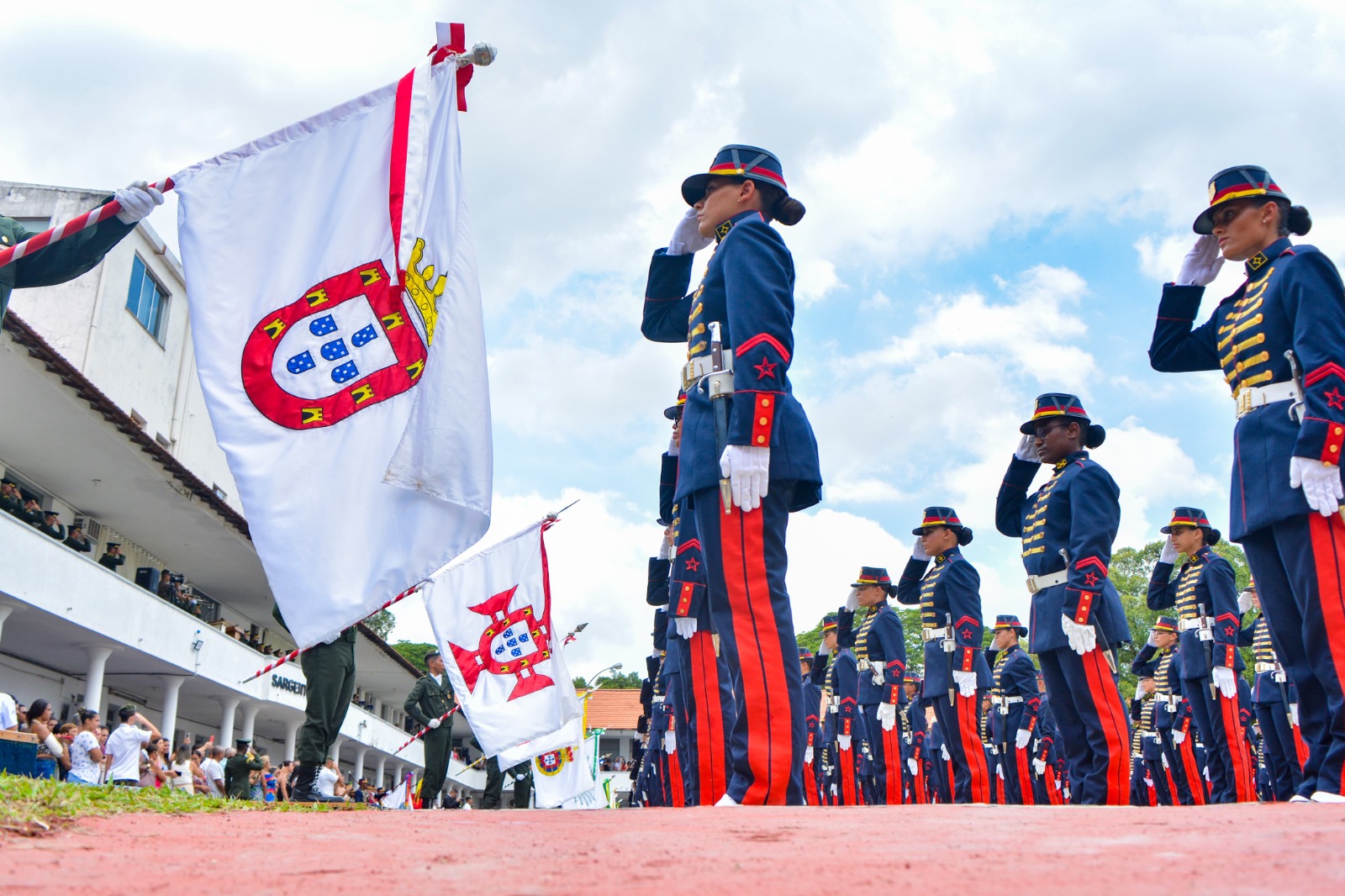 Finalizando, o General Pedrotti concitou os Alunos a terem "o espírito de determinação e o compromisso assumido perante a Bandeira Nacional como fonte de motivação para superar os obstáculos do ano de formação".