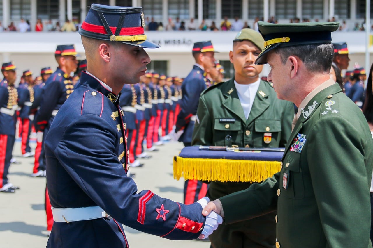 O Aluno Lucas Neves Salustino, Mecânico de Viatura, primeiro colocado do 1º ano CFGS, recebeu o Sabre das mãos do Vice-Chefe do DECEx como justo reconhecimento por sua dedicação aos estudos.