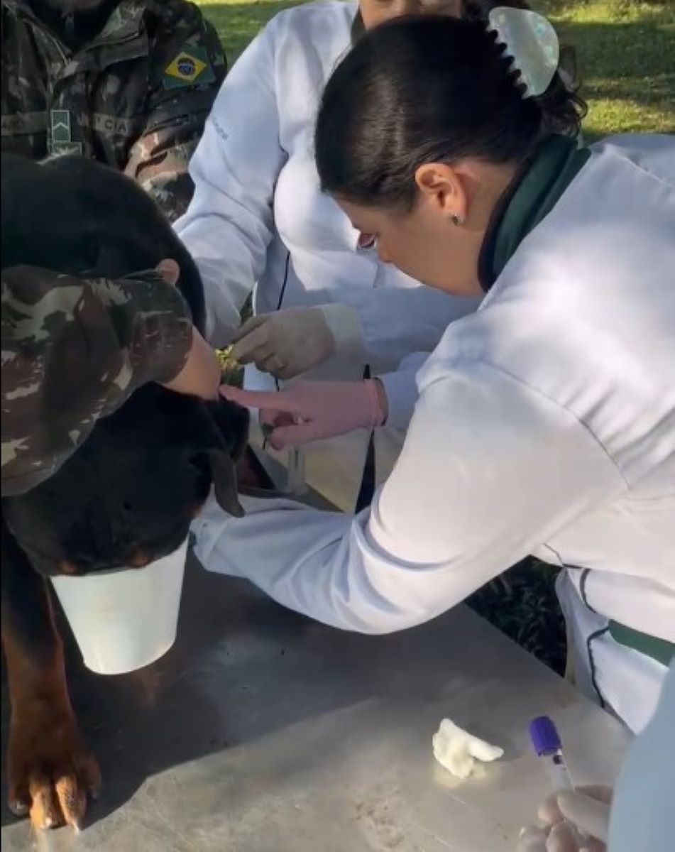 Curitiba (PR) – No dia 11 de junho, estudantes do curso de Medicina Veterinária da Universidade Cesumar realizaram coleta de sangue para exames dos cães da Seção de Cães de Guerra da 5ª Companhia de Polícia do Exército (5ª Cia PE), no Forte do Pinheirinho. A ação faz parte de um convênio entre a universidade e a 5ª DE.