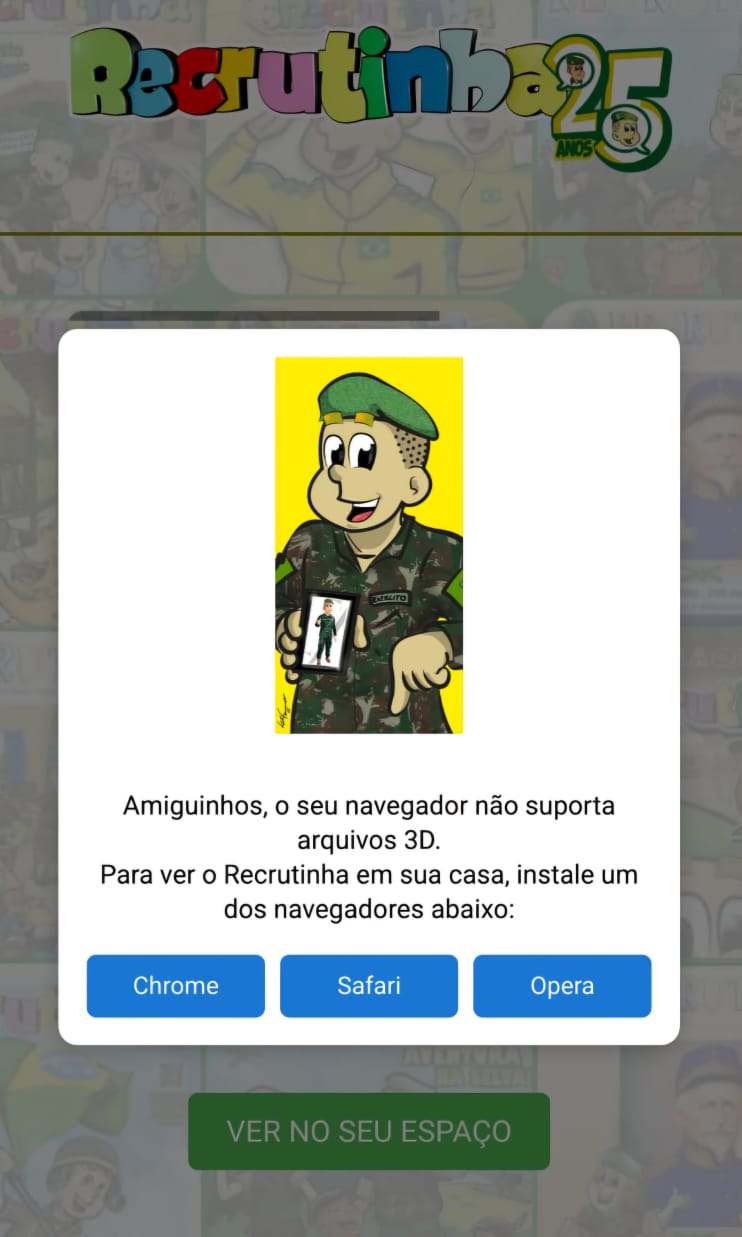 A funcionalidade de realidade aumentada do Recrutinha está disponível exclusivamente para dispositivos móveis. Para a experiência interativa, é necessário que os usuários acessem o link por meio de um smartphone ou tablet. Os navegadores compatíveis com o recurso são o Chrome, o Safari e o Opera.