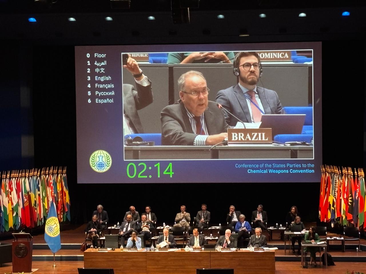 Durante a declaração oficial do Brasil, o Embaixador Fernando Simas Magalhães ressaltou o papel estratégico do EB por meio do Laboratório de Análises Químicas (LAQ) do IDQBRN — único laboratório designado pela OPAQ na América Latina e Caribe.