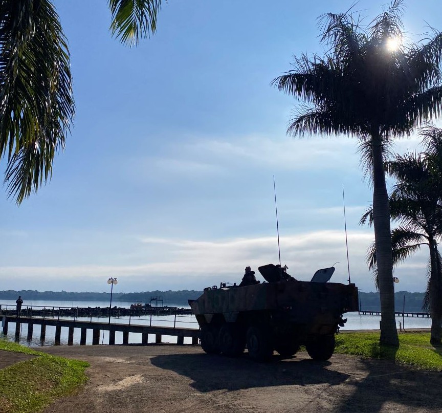 Batalhão de fronteira recebe Guarani e faz testes com o blindado em lago