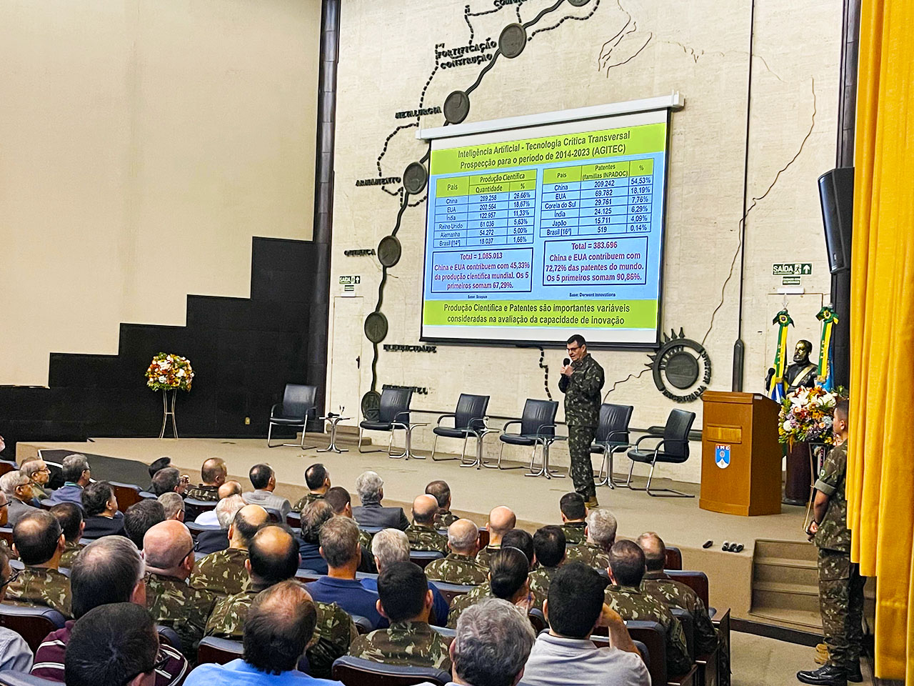 Logo em seguida, o General de Divisão Juraci Ferreira Galdino, Comandante do Instituto Militar de Engenharia, dirigiu-se aos participantes do evento ressaltando que o conhecimento está cada vez mais concentrado em poucas nações, inclusive na área de IA. Nessa área, mostrou que os indicadores de esforço de inovação como produção científica, depósito de patentes e investimento em pesquisa e desenvolvimento nacionais são bastante modestos. Lançou assim temas essenciais para nortear o debate ao longo do evento.