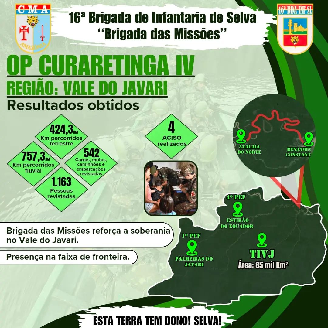 Já no Vale do Javari, as ações se concentraram na proteção da terra indígena local e na preservação do meio ambiente. Mais de 50 militares percorreram a região por via fluvial e terrestre, inspecionando veículos, embarcações e revistando pessoas. Paralelamente, ações cívico-sociais foram desenvolvidas junto às comunidades locais, para levar serviços de saúde e educação.
