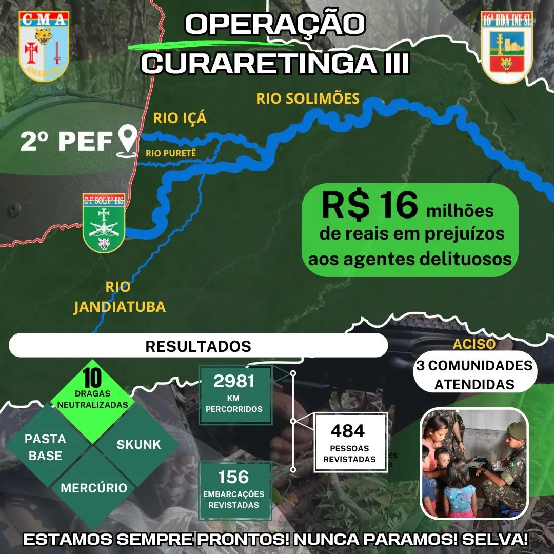 Tefé (AM) – A Operação Ágata tem o objetivo de intensificar a presença do Estado na faixa de fronteira e de combater crimes transfronteiriços e ambientais. Na região de Tefé, no Amazonas, essas ações resultam na Operação Curaretinga, conduzida pela 16ª Brigada de Infantaria de Selva. São realizadas patrulhas, postos de controle, revistas a pessoas e embarcações, além de incursões em localidades suspeitas.
