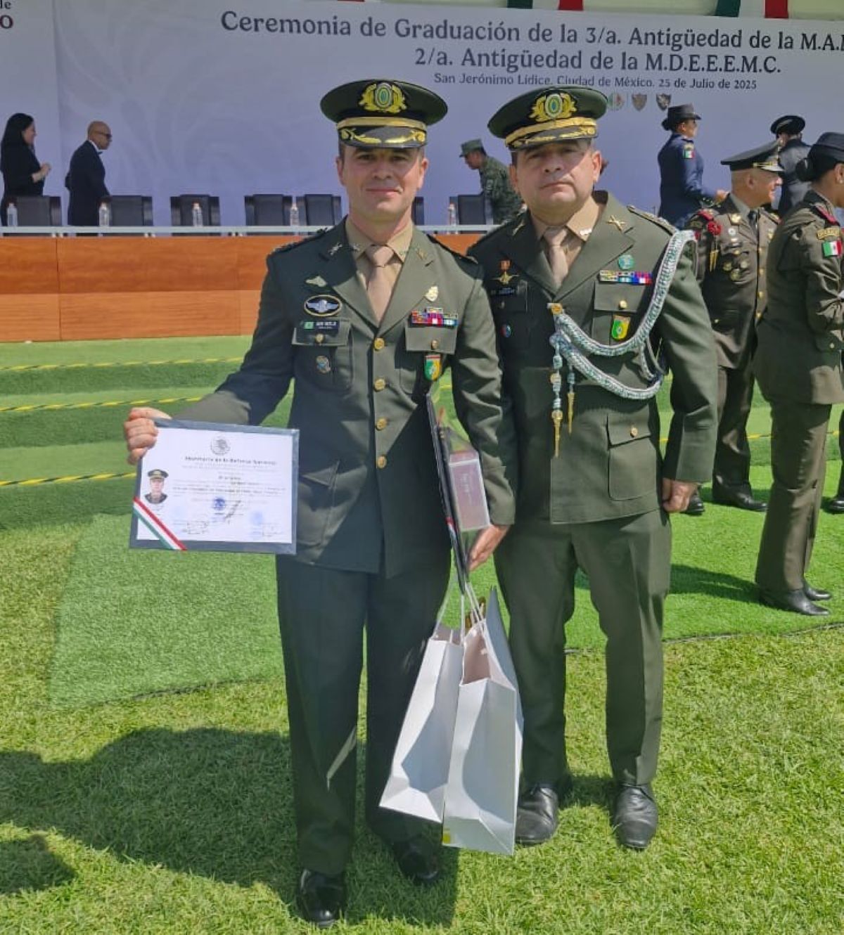 Na cerimônia de encerramento, foi outorgado ao Maj Iuri Melo Tavares o Diploma de Reconhecimento por ter obtido o 2º lugar do Curso, por sua dedicação, empenho e profissionalismo durante as atividades desenvolvidas, tendo recebido os cumprimentos do General de Brigada Bernabé Bernado Chávez Lira, Diretor-Geral de Escola Superior de Guerra, e do Adido Militar do Brasil no México, Coronel Antonio Douglas Neves Santos.