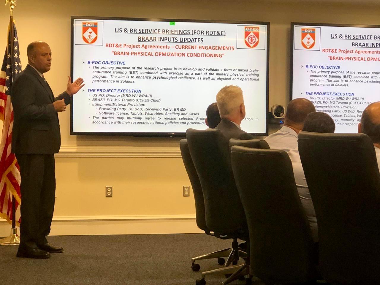 Como parte dos trabalhos, o Coronel Duarte, pesquisador sênior no projeto "Otimização do Condicionamento Cerebral e Físico (B-POC) como uma Ferramenta de Treinamento para Melhorar a Resiliência dos Soldados ao Estresse de Combate", fez a sua apresentação às comitivas. Ele abordou os fundamentos científicos do projeto, bem como as demandas administrativas e logísticas envolvidas.