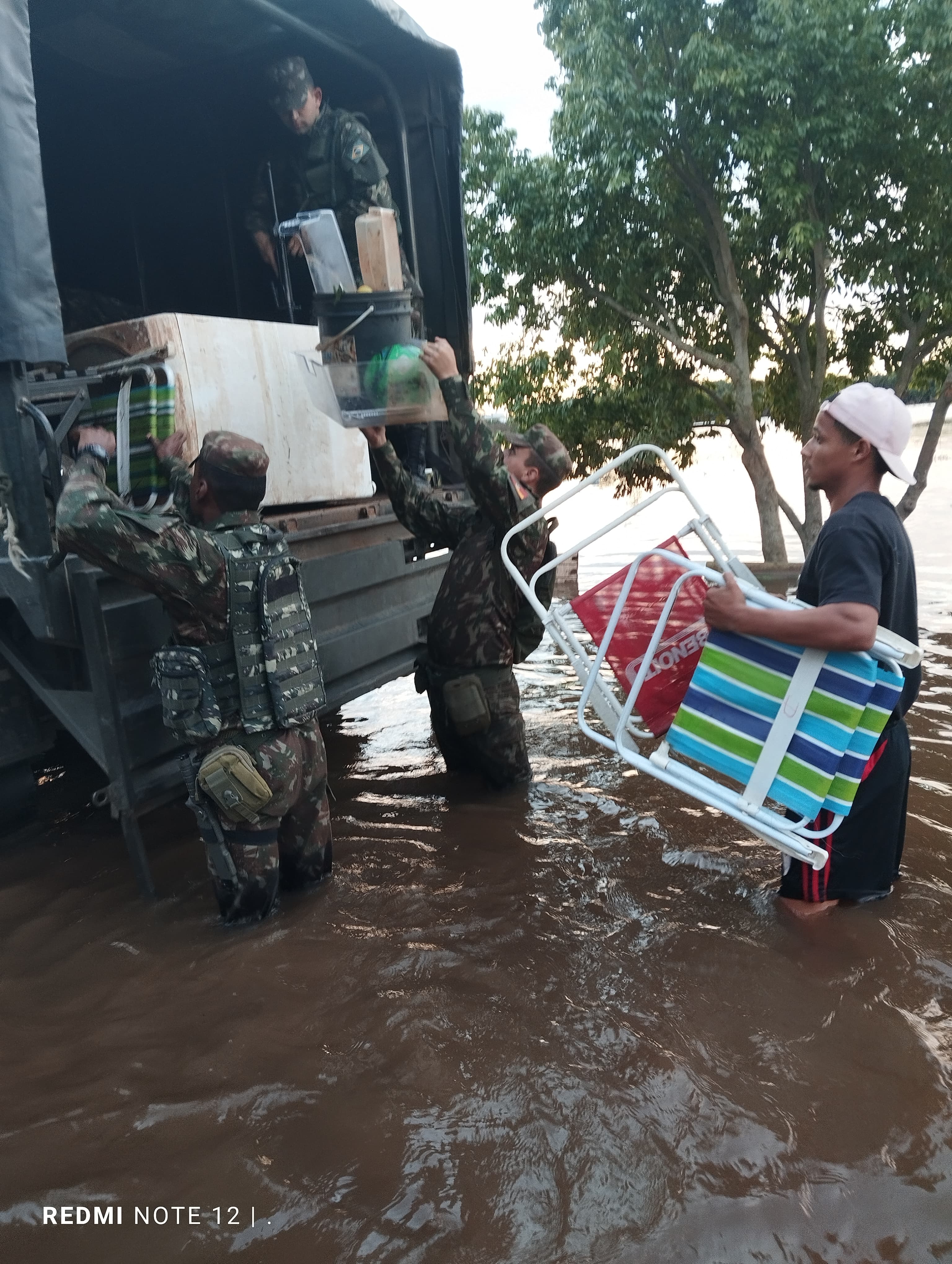 Eldorado (RS) – Militares do 3° Regimento de Cavalaria Mecanizada e 3° Batalhão Logístico colaboram com voluntários civis para atender a população atingida pelas chuvas na cidade de Eldorado do Sul.