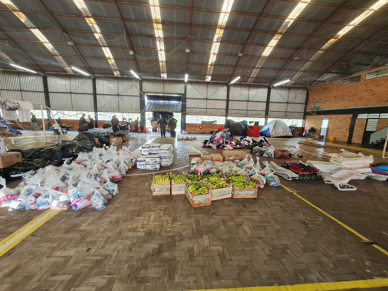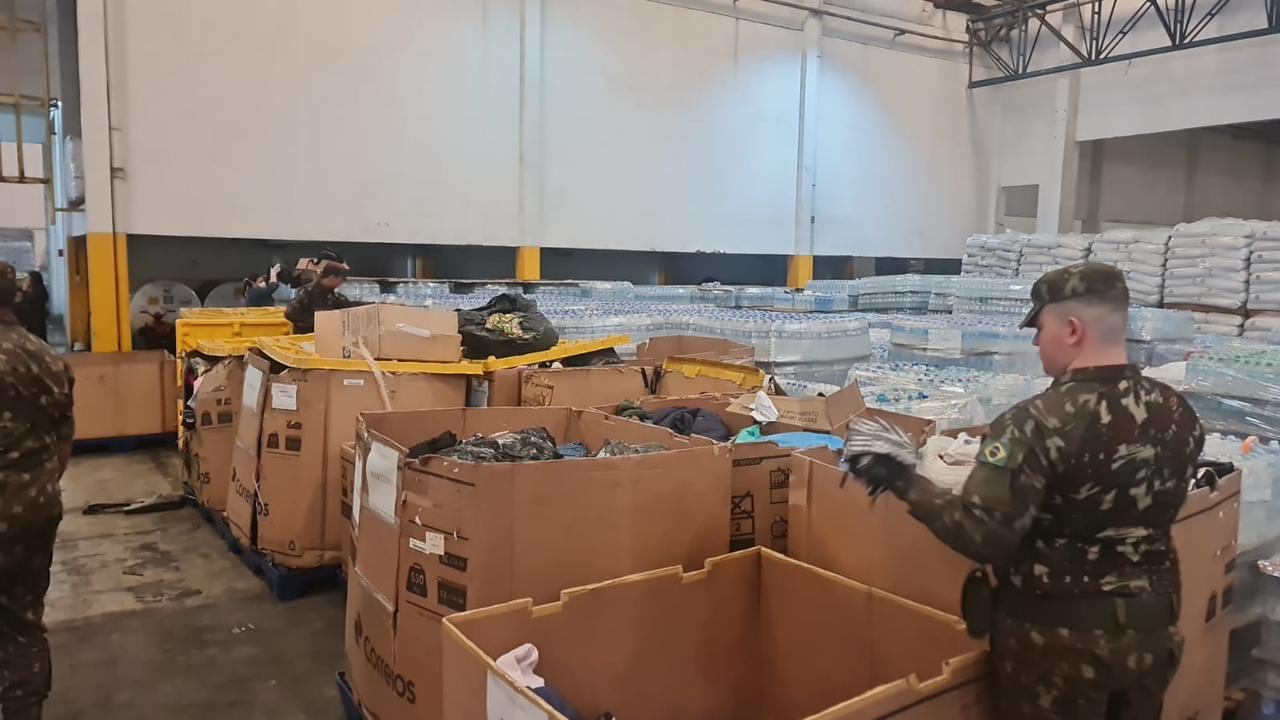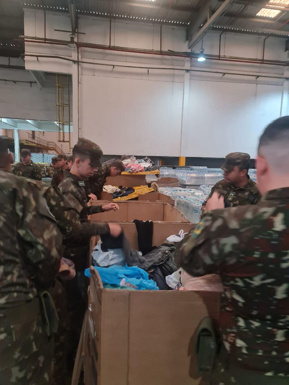 No dia 22 de maio de 2024, o 3° RCMec, em conjunto com voluntários civis, realizaram a organização e triagem de donativos para serem entregues aos abrigos destinados às famílias atingidas pelas enchentes no Rio Grande do Sul.