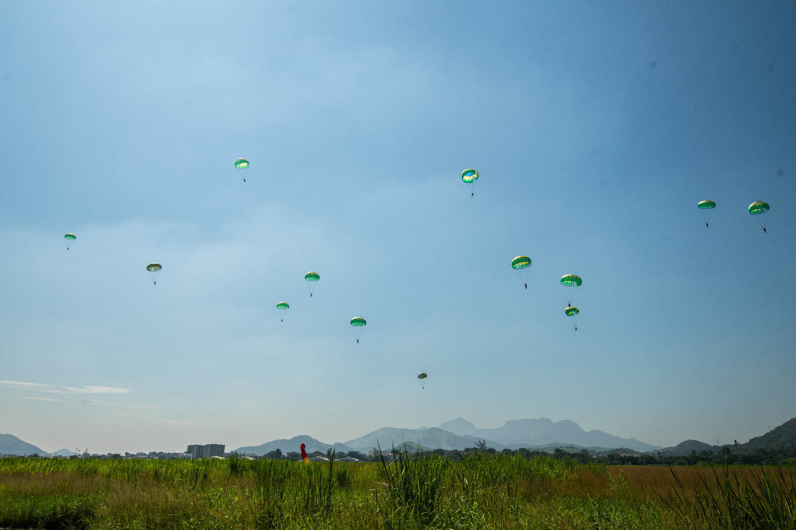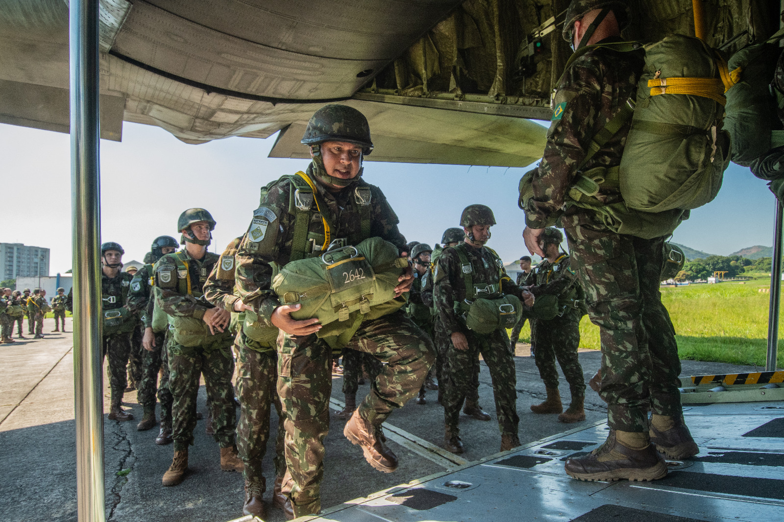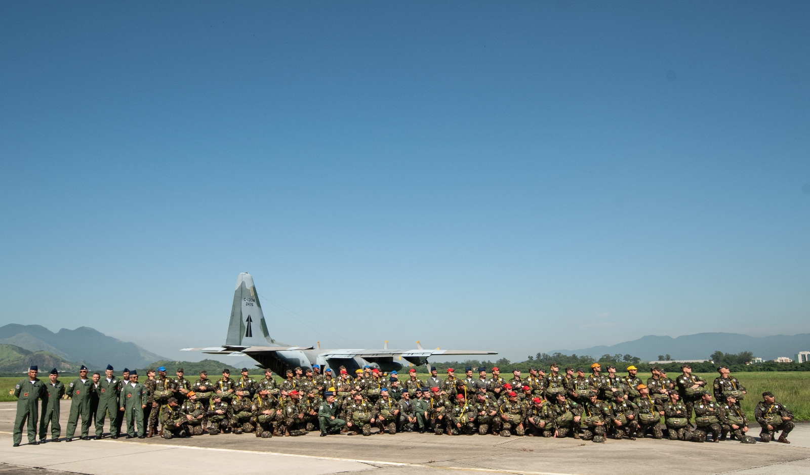 O C-130 Hércules, também chamado de "gigante” pelos paraquedistas. Agora, ele dá lugar ao KC-390 Millenium, fabricado pela Embraer, empresa que compõe a Base Industrial de Defesa. De fabricação nacional, o avião herda as melhores características de seu antecessor.