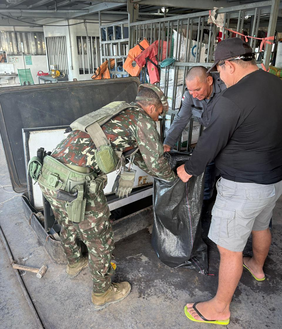 A abordagem foi realizada no contexto da Operação Ágata 2025/Comando Conjunto Apoena, sob o Comando do 9º Distrito Naval (9ºDN), que intensifica a presença do Estado e colabora no combate aos crimes transfronteiriços e ambientais nas áreas lindeiras. Durante a inspeção de uma embarcação regional, com o apoio de um cão farejador do Cmdo Fron Solimões/8º BIS, foram lcocalizados entorpecentes escondidos sob o assoalho da embarcação, exigindo a retirada parcial da estrutura para acesso ao material ilícito.