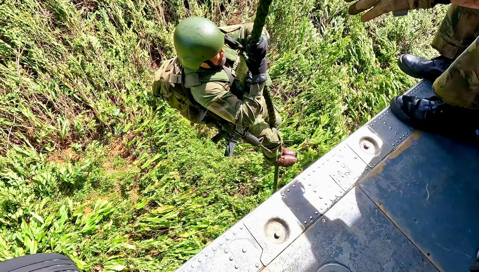 O deslocamento das tropas e dos materiais empregados foi realizado com o apoio das aeronaves H-60 Black Hawk, da Força Aérea Brasileira, e UH-15 Super Cougar, da Marinha do Brasil. No local do objetivo, a tropa realizou a infiltração por meio da técnica de descida de corda vertical, permitindo o desembarque ágil sem a necessidade de pouso da aeronave.