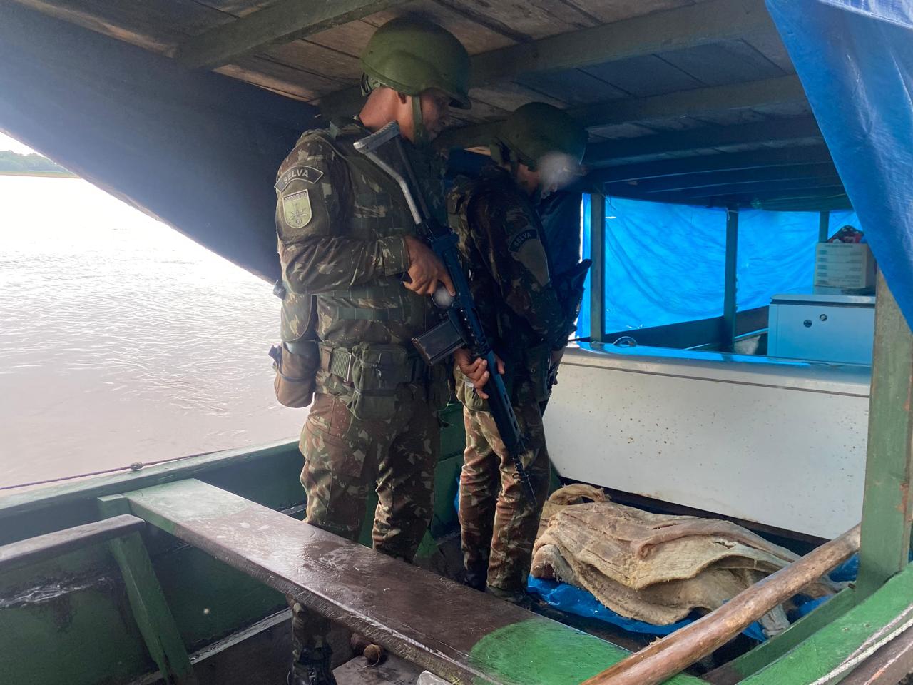 Os militares apreenderam cerca de uma tonelada de carne de pirarucu sem documentação. A espécie tem alto valor comercial e está sob defeso permanente nessa região País. Também foram apreendidas mais de 2 mil munições de calibre 16 sem registro apropriado. Suspeita-se que a munição estivesse sendo usada em atividades de caça e pesca ilegal. A equipe verificou que a carne de pirarucu estava imprópria para consumo humano, sendo descartada de maneira adequada. Já as munições foram encaminhadas às autoridades competentes para os procedimentos legais cabíveis.