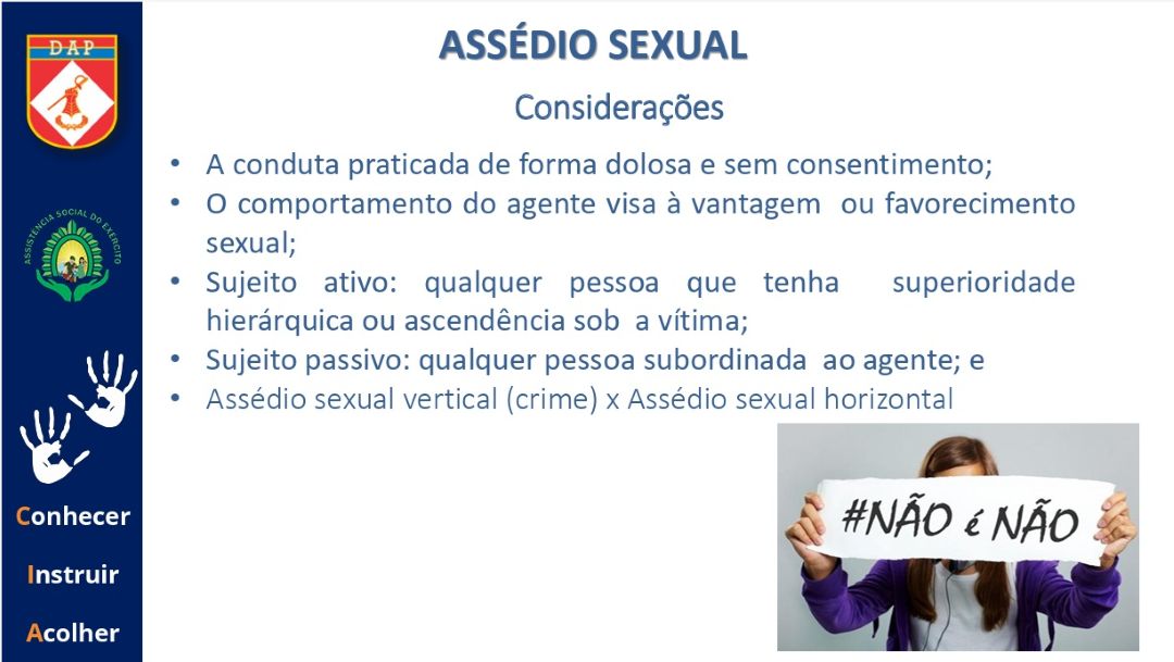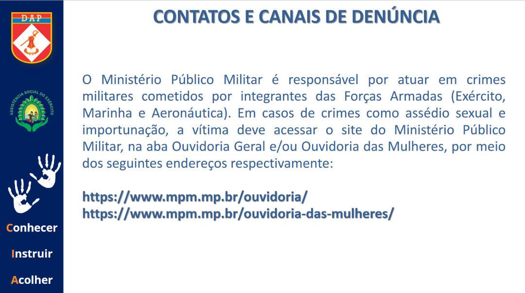 Nesse contexo, a Diretoria de Assistência ao Pessoal (DAP), órgão técnico-normativo subordinado ao Departamento-Geral do Pessoal, elaborou o caderno de orientação intitulado Capacitação CIA (Conheça, Instrua e Acolha) com o compromisso de promover diretrizes claras e procedimentos eficazes para prevenir o assédio moral, sexual e importunação no âmbito do Exército Brasileiro.